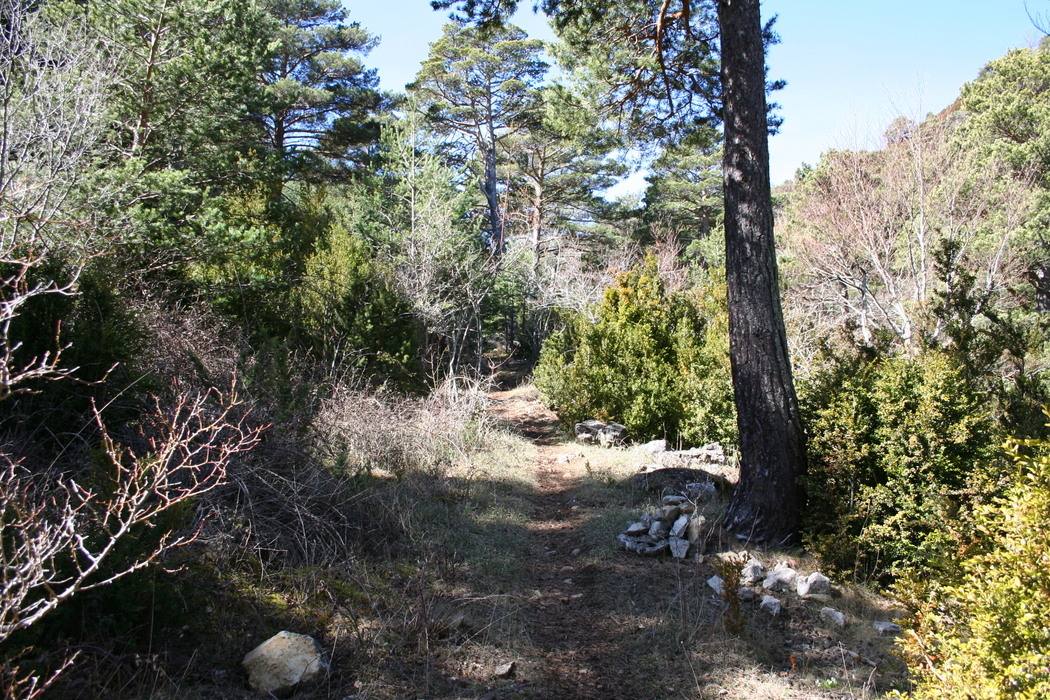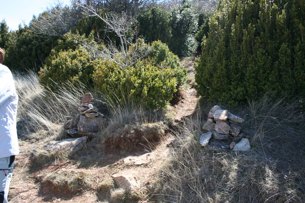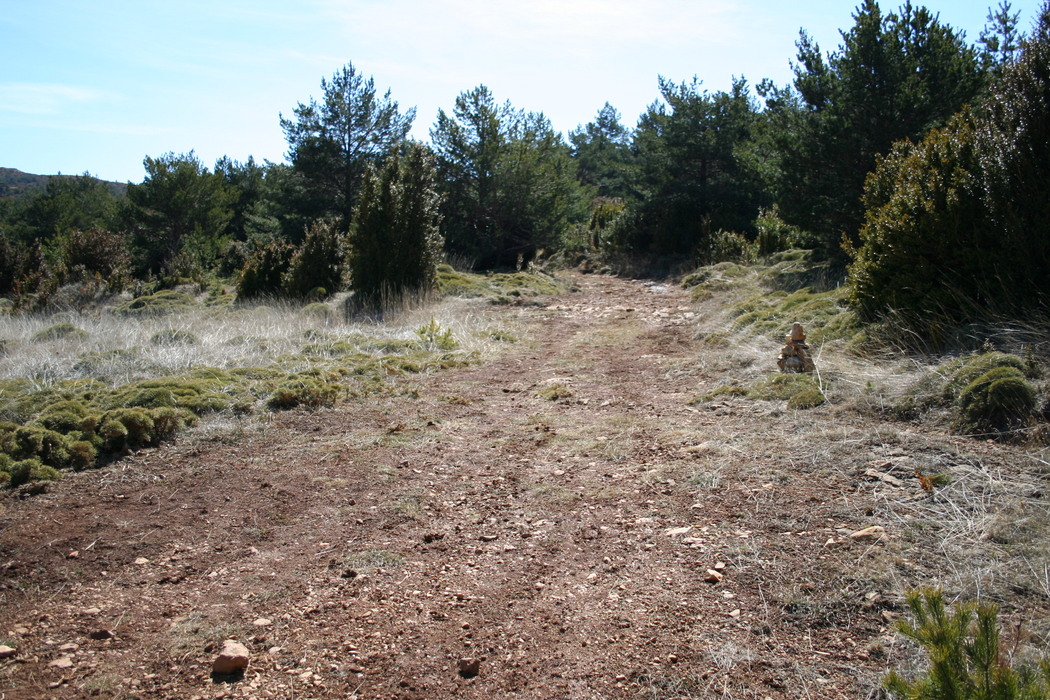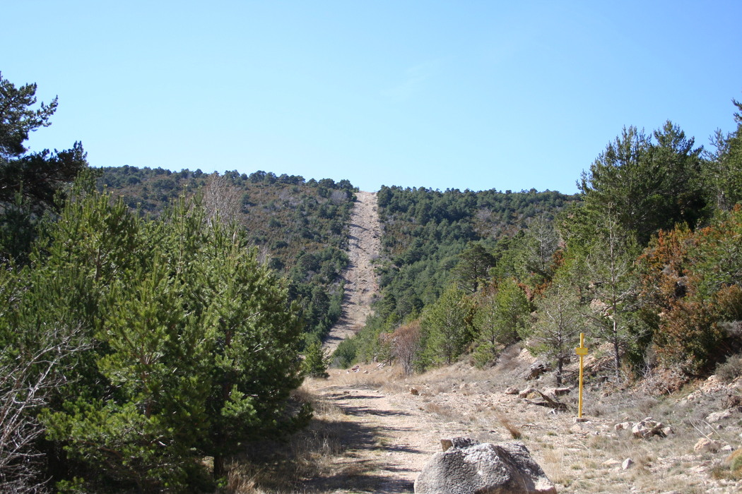 1 hora 00 minutos Apreciaremos claramente que la senda a nuestra derecha esta acompañada en todo momento por el soterramiento de un Gasoducto mediante unos paneles indicativos de color amarillo. Ahora hay un poquito mas de desnivel y al final de esta parte nos encontramos un monte con gran desnivel carente de arbolado por donde circula el Gasoducto. Algunos excursionistas prefieren avanzar hacia el Pico Gratal por esta vía, con lo que se gana tiempo, aunque es preferible tomar un pequeño desvío a la derecha convenientemente marcado con unos mojones a través de un pequeño bosque.