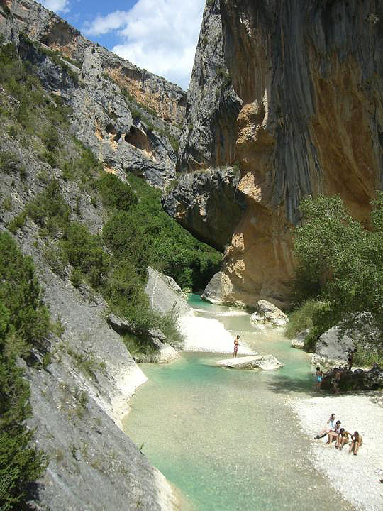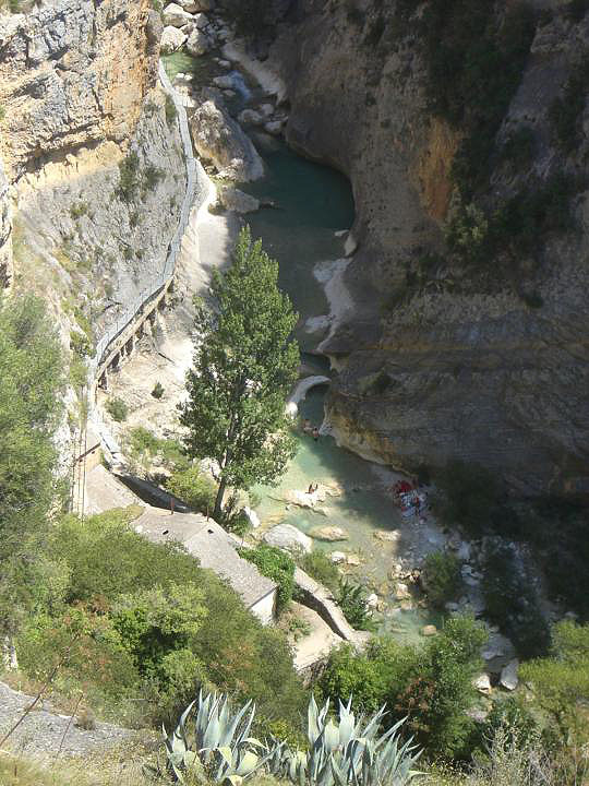 Continuamos la excursión siguiendo el cauce del río, caminando siempre que sea posible por la senda que discurre en todo momento junto al río hasta llegar al barranco de la Fuente, donde parte una senda por la que podremos llegar hasta Alquezar, aunque recomendamos subir a las pasarelas y continuar el descenso por el río. En todo este tramo nos encontraremos con muchos rincones donde parar y disfrutar de un buen baño.