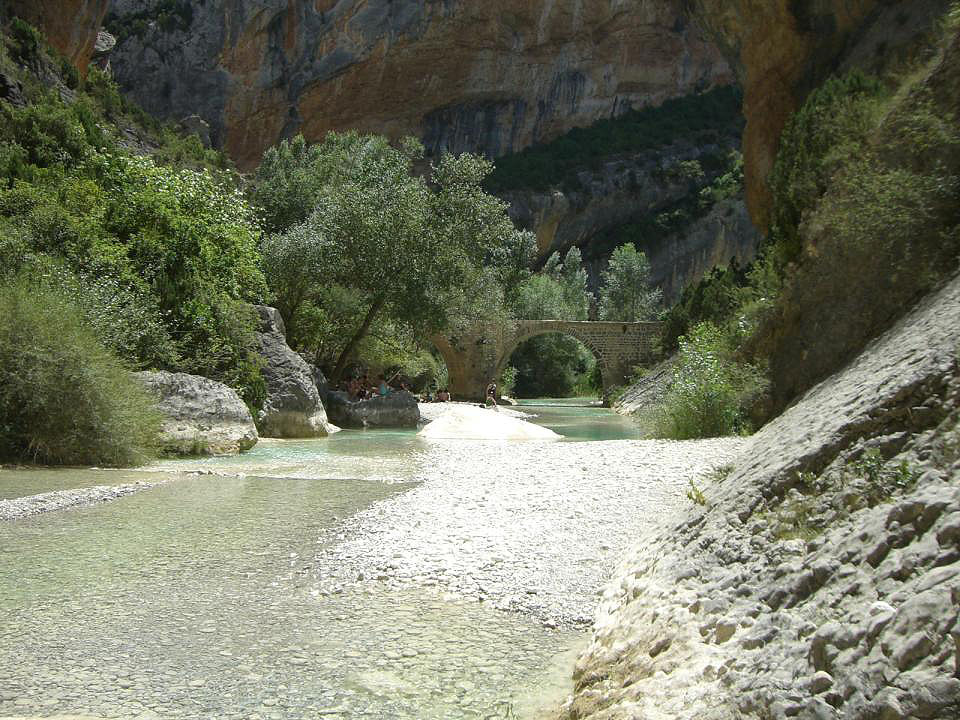 Pasado el collado la senda desciende por la ladera del cañon del Vero directamente hasta el puente medieval de Villacantal, y en cuyo trayecto podremos ir descubriendo las pozas y badinas del río que posteriormente recorreremos.