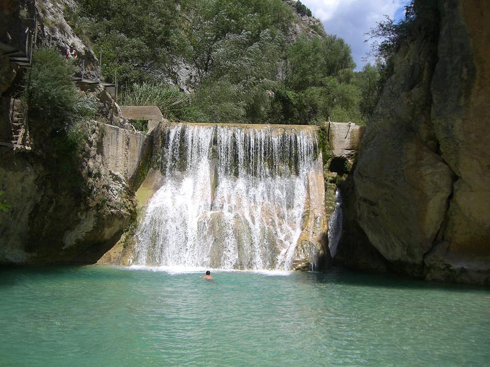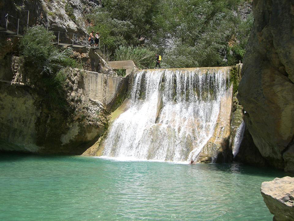 1. Volviendo por las pasarelas hasta el barranco de la Fuente y ascendiendo por la senda que discurre por el fondo del propio barranco entre exuberante vegetación y altas paredes rocosas, en unos 45 minutos.