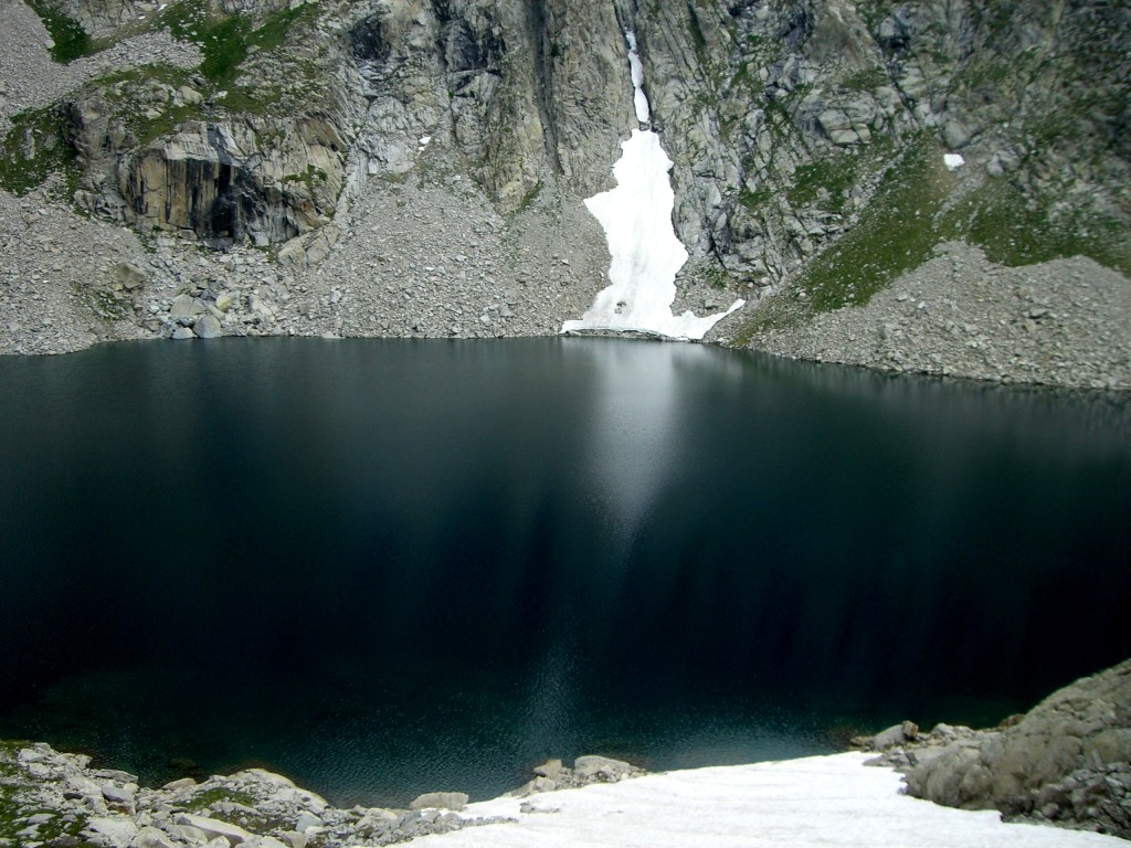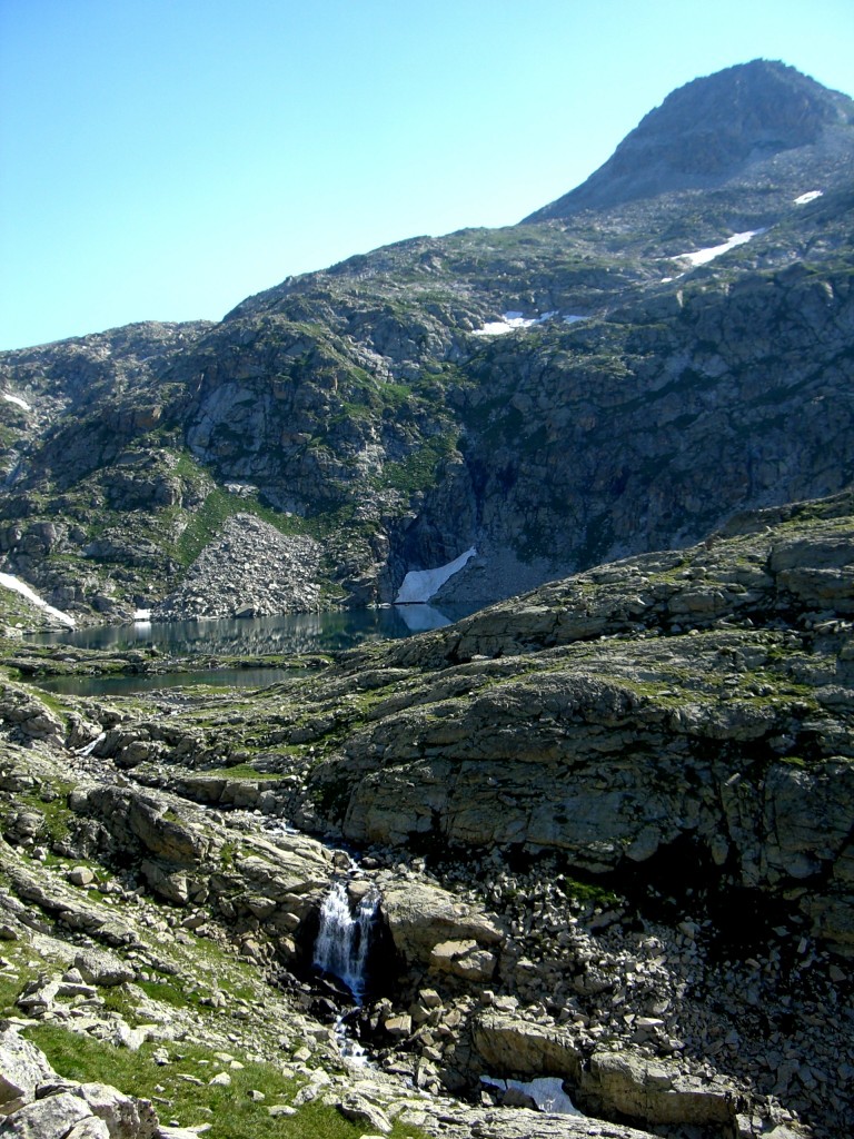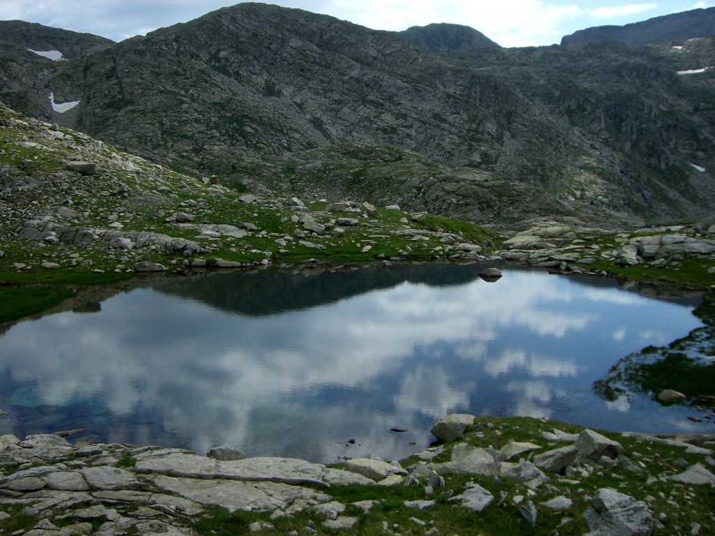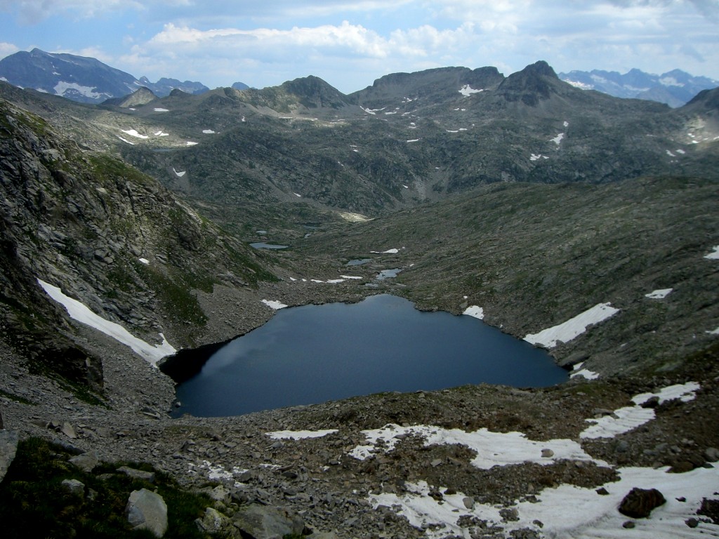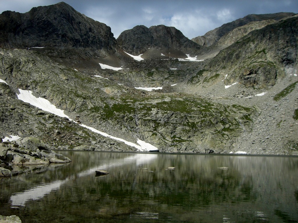 A partir de los ibones de Eriste no existe ninguna senda marcada que seguir asi que nos guiaremos por el torrente que baja del Ibón Negro de Posets y va recorriendo todos los ibones y pequeñas balsas que conforman la Bal d’es Ibons. Remontando el torrente el primer ibón en aparecer es el de Las Alforjas o Alforches.