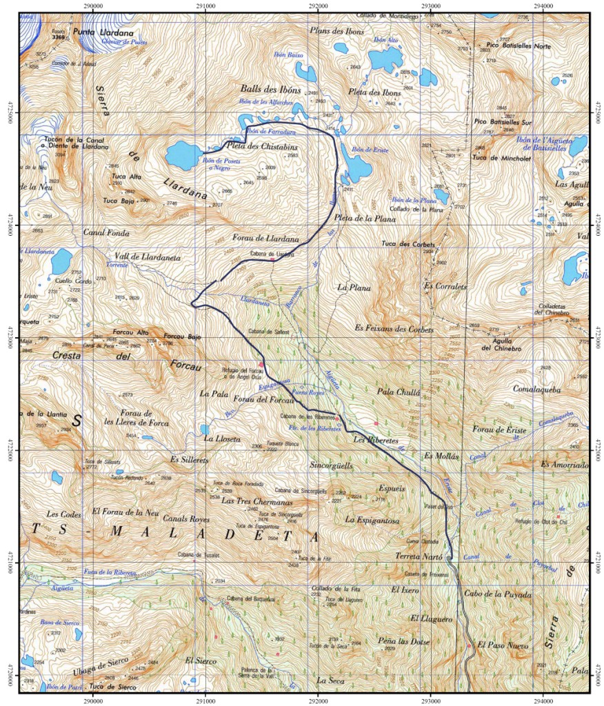 El recorrido finaliza en el ibón Negro de Posets, rodeado por la Sierra de Llardana y custodiado por picos de más de 3.000 m como el Diente de Llardana al oeste (3.094 m) o el pico Posets o Punta Llardana al norte (3.369 m)