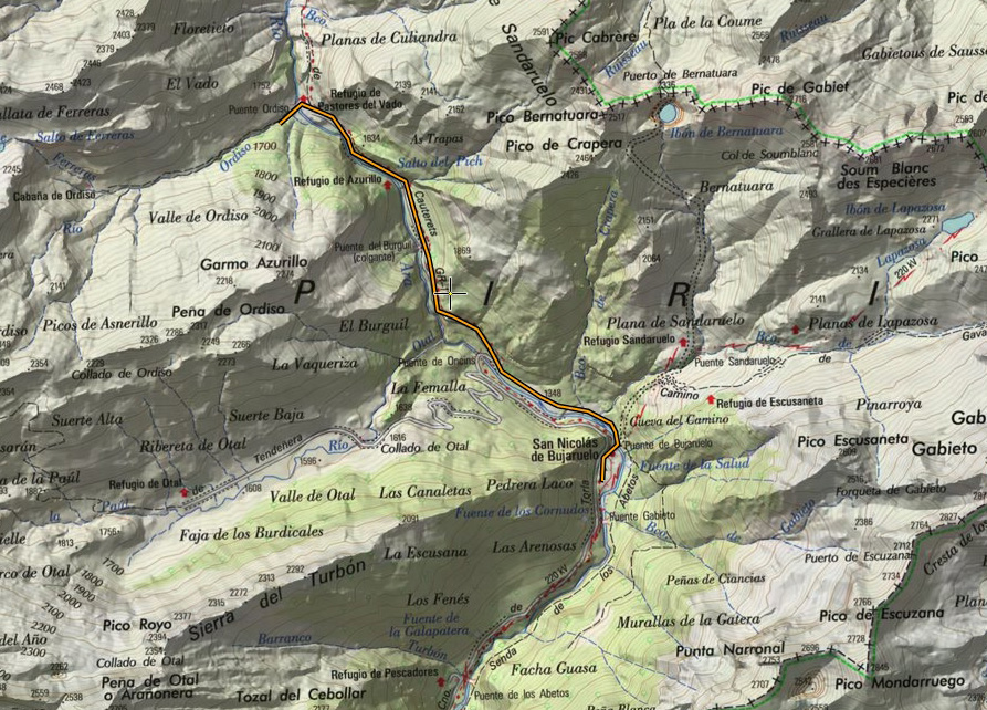 Desde Torla continuamos por la carretera A-135 en dirección a Ordesa. A unos 3 km de Torla y a la altura del Puente de los Navarros tomamos la pista asfaltada que parte a nuestra izquierda y que en unos 6 km nos conducirá hasta San Nicolas de Bujaruelo, punto en el que finaliza la pista transitable para vehículos.