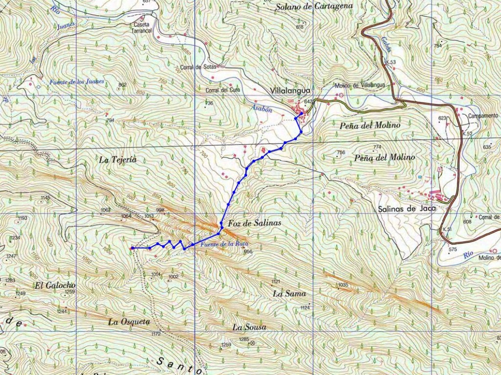 Desde el pueblo de Villalangua tomamos la calle que detrás de la iglesia desciende hasta el río Asabon, el cual, atravesaremos por una pequeña pasarela. Continuamos hacia la izquierda para coger la pista que nos dirige directamente a la Foz de Salinas. Más adelante abandonaremos la pista para tomar el sendero interpretativo que asciende en todo momento junto al barranco de Salinas y en el que podremos contemplar un buen número de pequeñas cascadas hasta llegar en unos 30 minutos a la gran cortada en la roca, antesala del corazón de la Foz de Salinas.