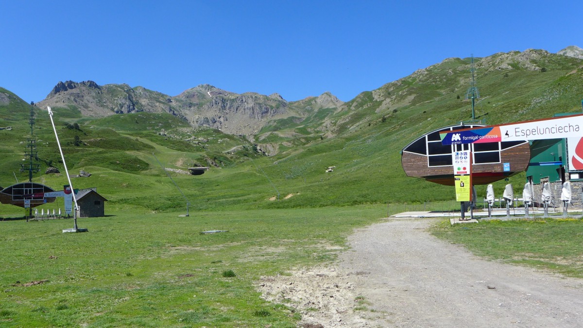 Debemos situarnos entre los telesillas de Espelunciecha y Batallero y nos dirigiremos entre praderas hacia un pequeño puente que veremos enfrente nuestro. Existe una pequeña senda que sale detrás del telesilla de Espelunciecha.