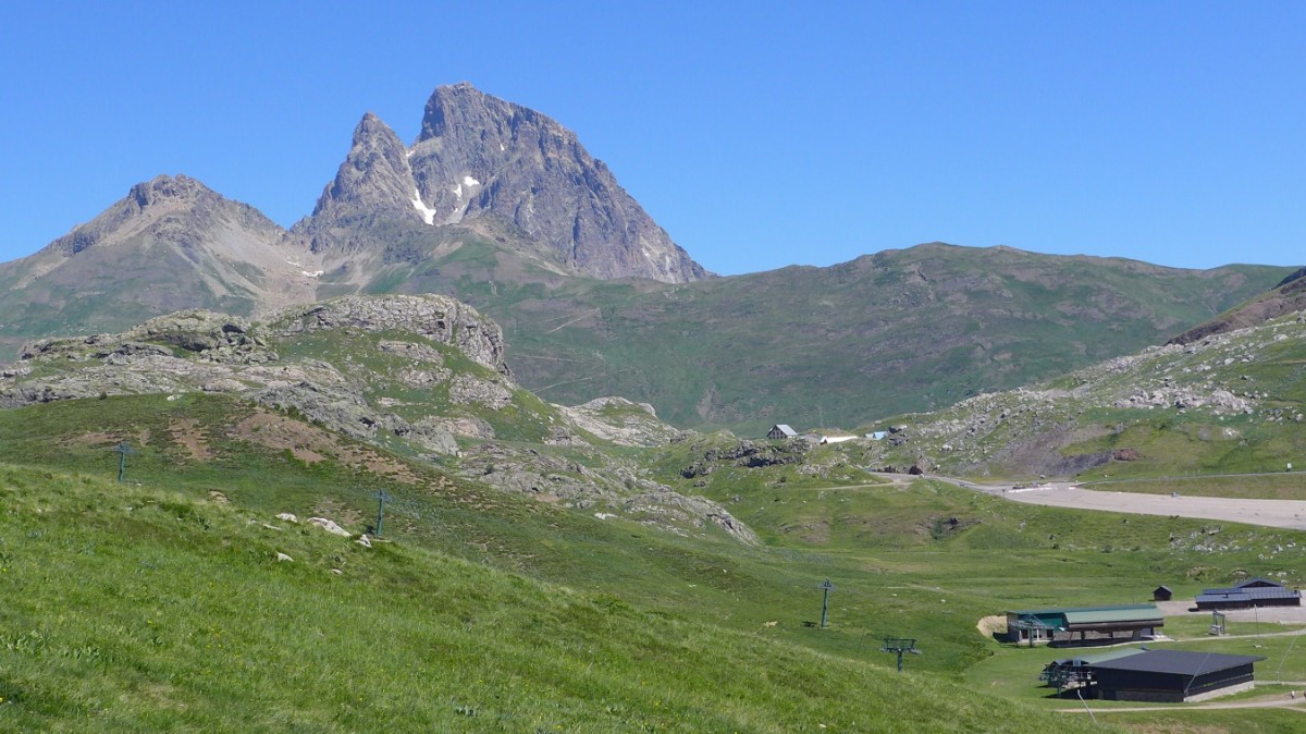 Vistas del imponente Pico de Midi d´Ossau, con las pistas de Formigal-Portalet a la izquierda y el puerto del Portalet (frontera con Francia) en el centro de la imagen.