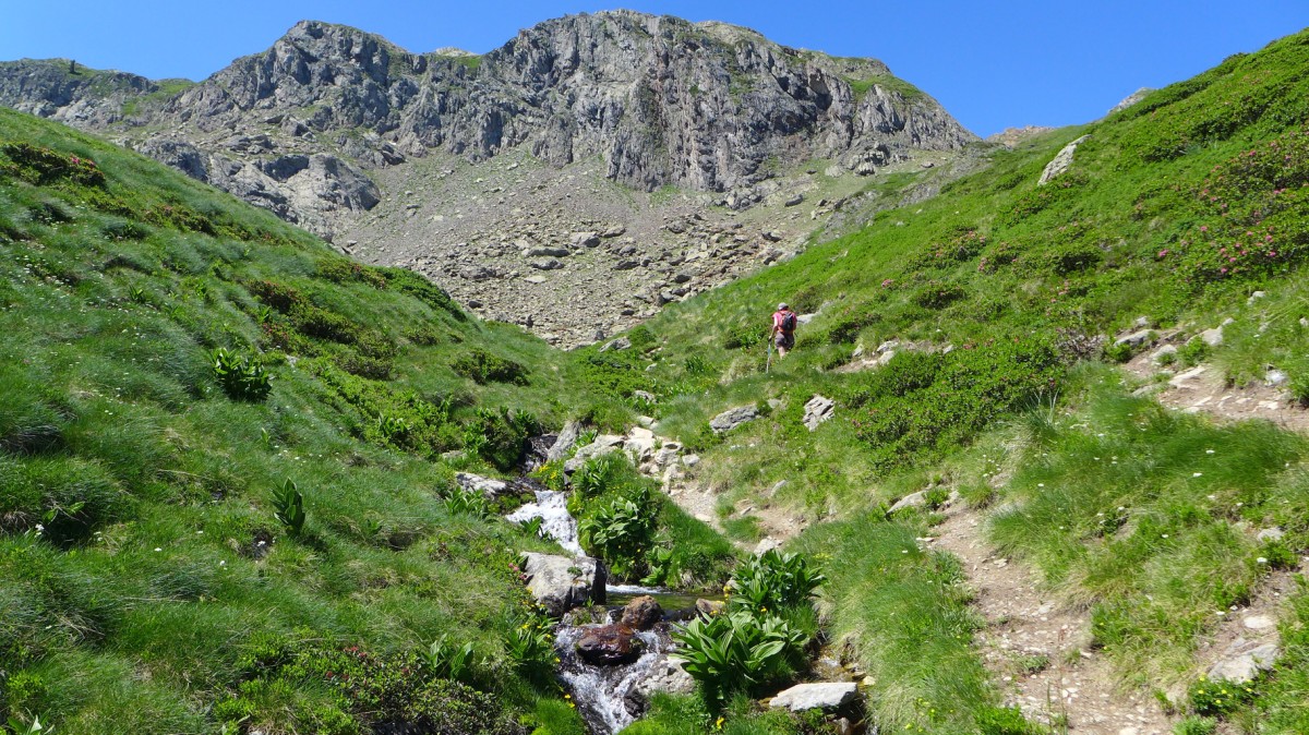 Sendero final de acceso a Espelunciecha, donde se aprecia el canchal de roca en cuya base se ubica el Ibon de Espelunciecha