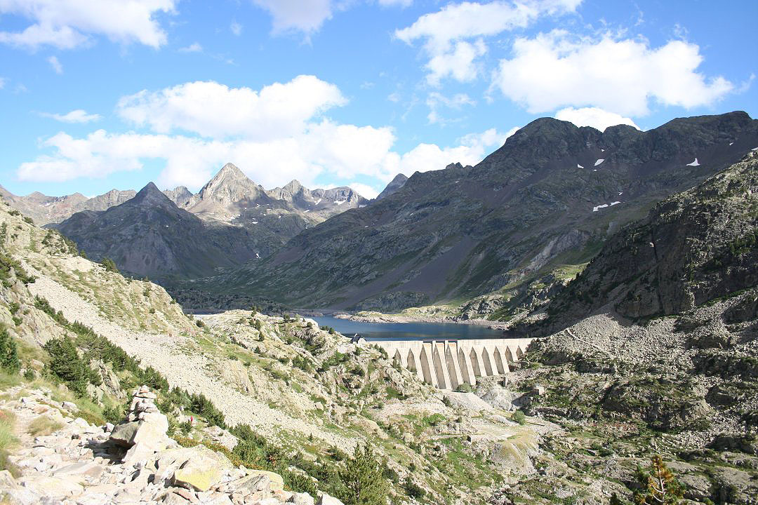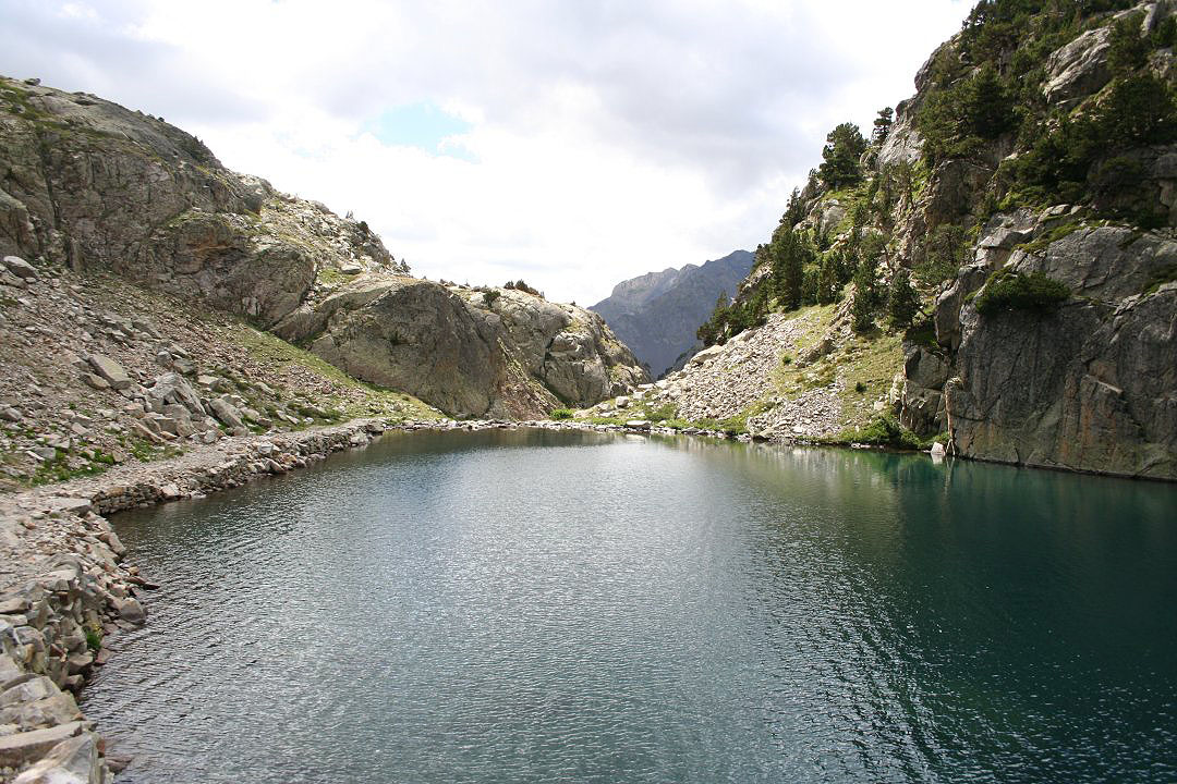 Una vez superado el fuerte desnivel y el collado accedemos en primer lugar a una pequeña presa de regulación, tras la cual aparecerá ante nosostros el Ibón de Arriel Bajo.