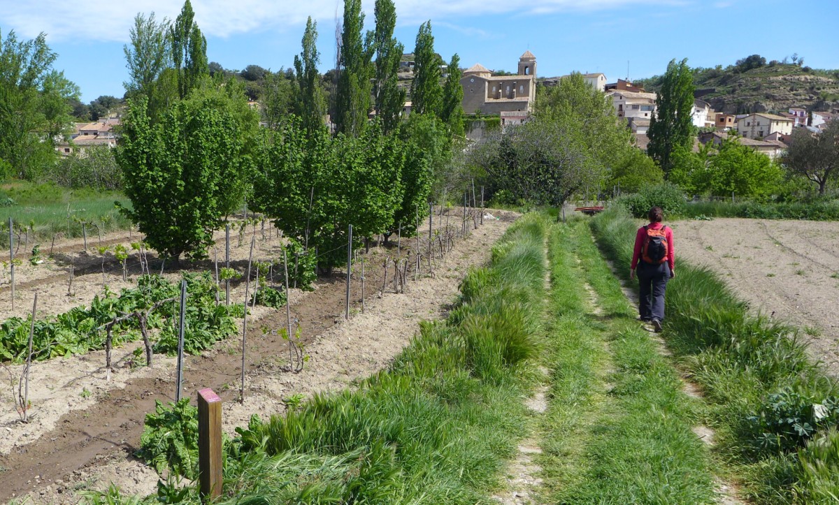 Un estrecho camino perfectamente señalizado con hitos de madera discurre entre acequias de riego y pequeñas parcelas de huerta donde es habitual encontrarse con los hortelanos de Pozan atendiendo sus tareas del campo.