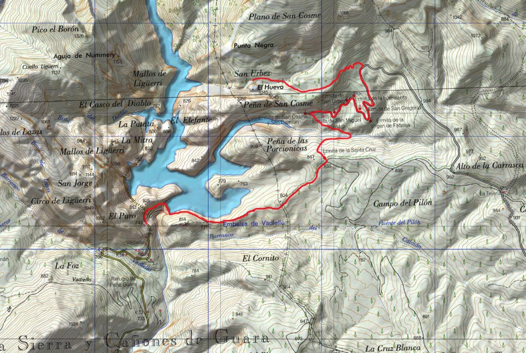 Clásica ruta senderista de la Sierra de Guara con inicio en el Embalse de Vadiello y que pasando por las Ermitas de la Santa Cruz, San Cosme, San Urbez, Fuensanta, Virgen de Fabana y San Gregorio nos llevará atravesando el bosque plano hasta los pies del Huevo de San Cosme