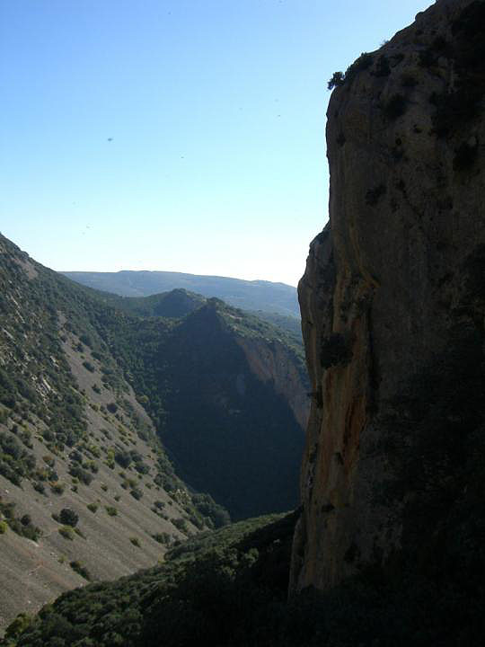 Desde el collado una senda desciende de manera directa y con una fuerte pendiente hasta el fondo del barranco. Hay que realizar el descenso con cuidado ya que en algunos tramos la pendiente de la roca es considerable.