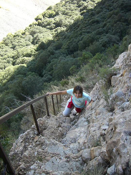 Transcurrido una media hora de travesía por el fondo del barranco nos encontraremos unos mojones que nos indicarán que deberemos dejar este y tomar la senda que nace a la derecha de este y asciende entre arbustos y carrascas hasta la Fuente de la «Puerta del Cierzo«. En esta zona es frecuente encontrarnos con escaladores. Continuando la ascensión llegaremos hasta un punto donde nos encontraremos con una placa que recuerda la muerte de un vecino de Barluenga. En este punto nos se nos ofrecen dos posibles alternativas de realizar la ascensión. La vía de la izquierda nos conducirá de manera más rápida y directa a través del «Paso de la Viñeta» hasta el collado de San Salvador si bien presenta mayor dificultad ya que hay que ascender por un terreno abrupto y escarpado provisto de sirgas y pasamanos. La vía de la derecha nos conduce por la «Senda de los burros» cuyo recorrido es más largo si bien no presenta ninguna dificultad. Lo habitual, si el terreno no se encuentra mojado o helado es realizar el ascenso por la viñeta y descender por el otro lado.