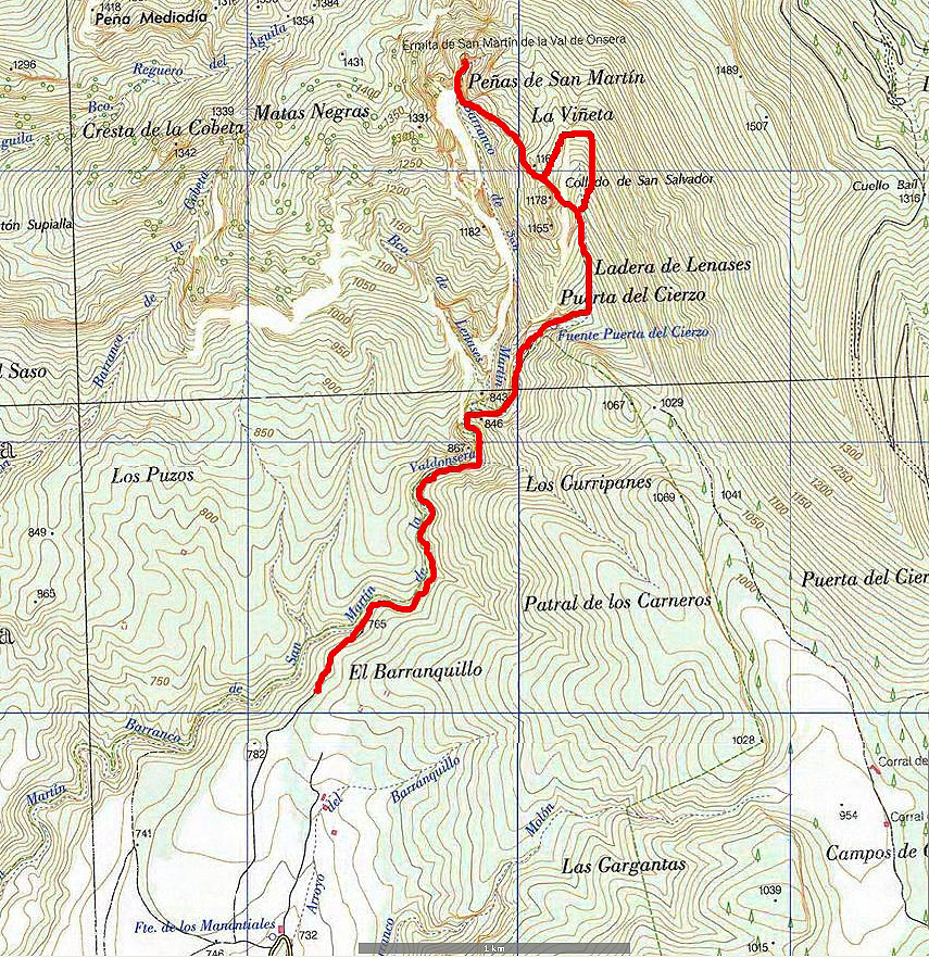 Ambas alternativas desembocan en el Collado de San Salvador, punto más elevado del recorrido y desde el cual se nos presentan unas magnificas vistas panoramicas sobre el barranco de San Martín y de las grandes paredes de roca que lo custodian, sobre las cuales habita una importante colonia de buitres leonados. Es interesante llevarse unos prismáticos para observar la actividad de estas aves.