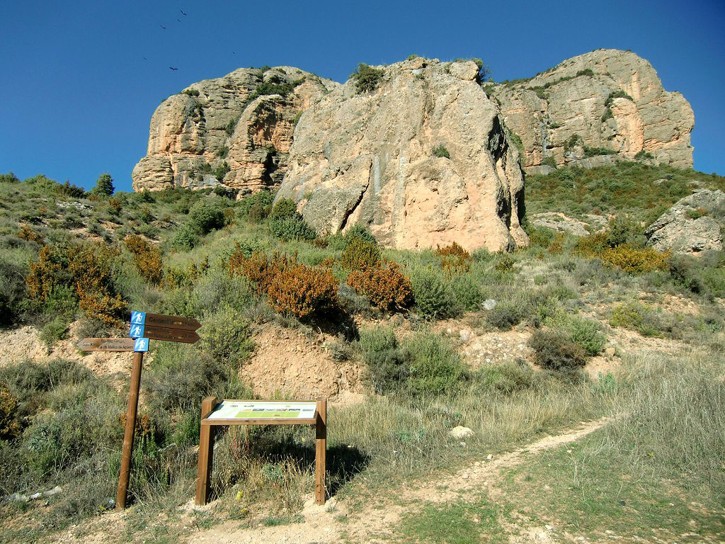 La localidad de Aguero se asienta a los pies de unas enormes moles pétreas conocidas como los Mallos de Aguero.  Un cómodo sendero nos permite en poco mas de 1 hora realizar un recorrido circular en torno a esta singular formación rocosa.  Ascenderemos también sin mucha dificultad hasta el espectacular collado formado entre la conocida como Peña Sola y la gran mole de roca de los Mallos de Agüero donde parece ser se asentó una pequeña fortificación, conocida como Castillo de Peña Sola de la que apenas queda resto alguno.