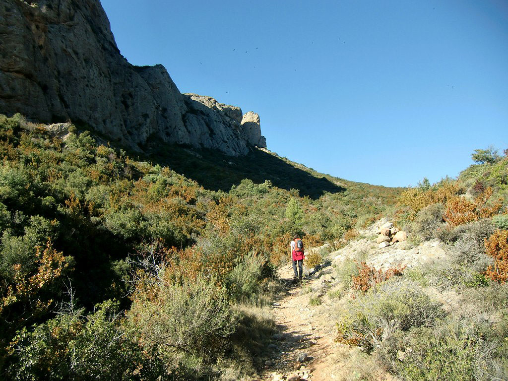 Continuamos por la pista forestal en dirección a nuestra izquierda que desciende en fuerte pendiente a los pies de la cara norte de los mallos.  Recorridos unos 500 metros por la pista, tomamos el primer desvió a la izquierda que rodea a los mallos y que recorrerá desde este punto la cara oeste de los mallos.